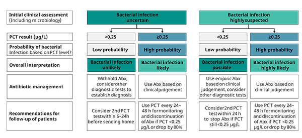 Surviving Sepsis Campaign[9]中介绍了PCT的使用,并建议将PCT用于抗菌素管理。 最好在败血症的诊断阶段进行PCT测定,以在给予抗生素前获得PCT的初始基线[11]。